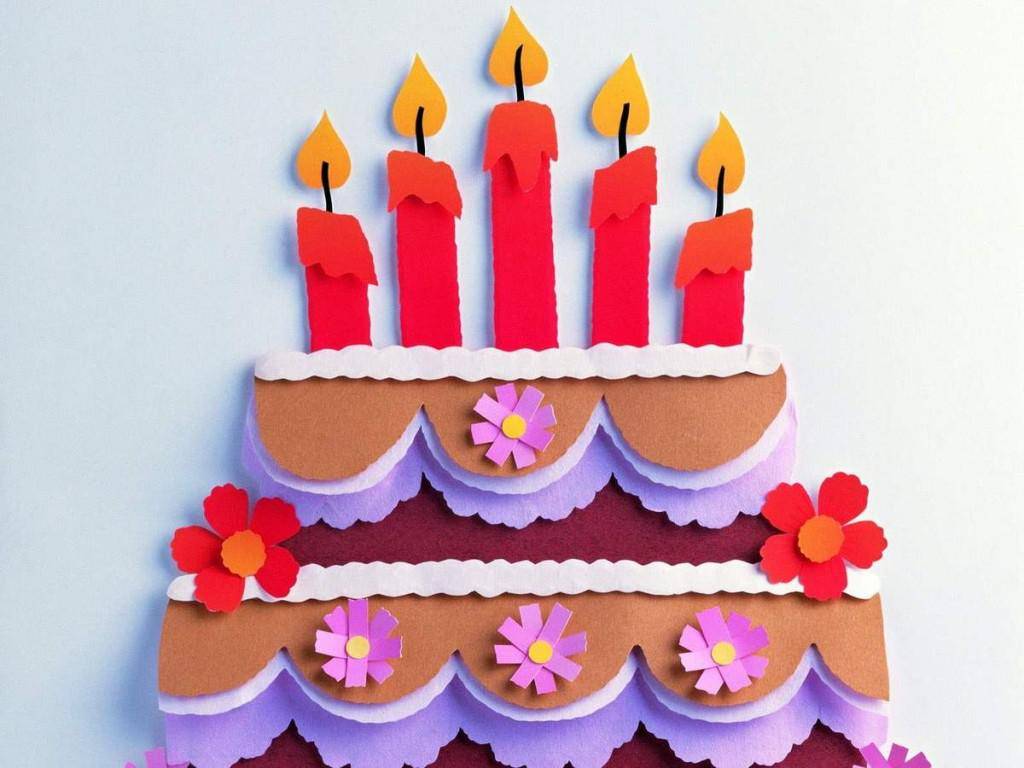 Накладывая каждый элемент открытки друг на друга, с использованием опять же двухстороннего скотча, можно создать такой объемный яркий торт!