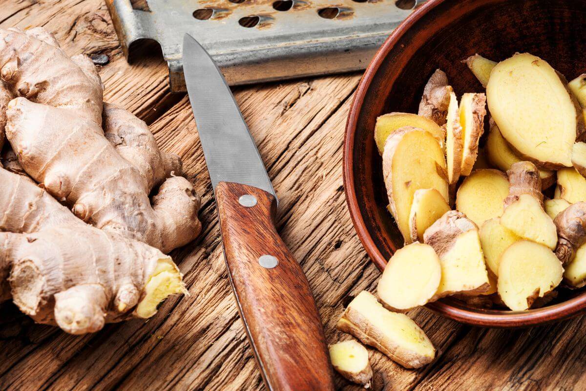При головной боли имбирь необходимо натереть на мелкой терке (подойдет свежий или высушенный корень), после чего добавить к нему немного воды, чтобы получилась однородная пастообразная масса, эту смесь надо прикладывать к вискам.