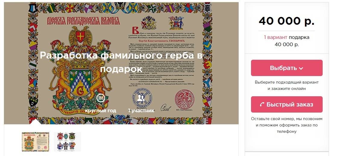 Стоимость сертификата на изготовление фамильного герба – 40 000 рублей. Организация также предлагает и другие услуги – восстановление генеалогического древа и поиск предков. Сертификат можно получить по электронной почте или забрать лично.