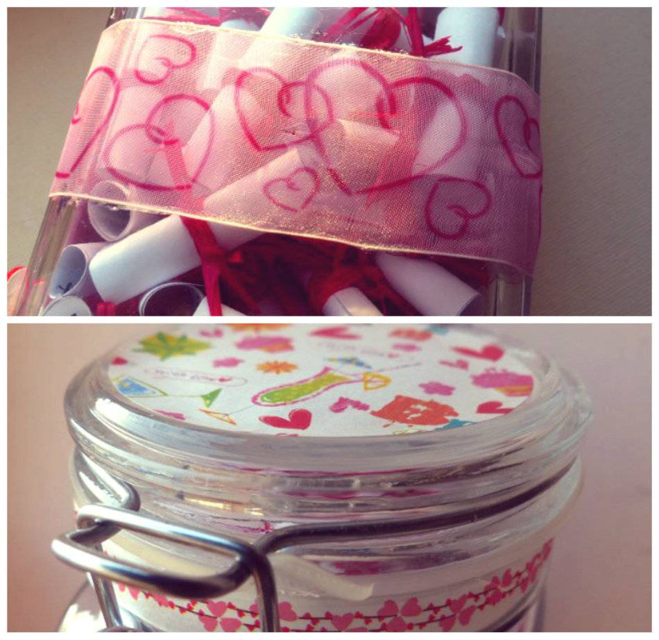 Сложите все записочки в емкость. К крышке привяжите красивую ленточку и повесьте на нее открытку. О таком сюрпризе в душе мечтает каждый, ведь изготовлена баночка с пожеланиями своими руками. 100 пожеланий, которые найдет виновник торжества внутри, затронут струны его души.