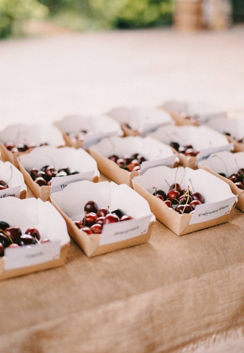 Это идеальный вариант для свадьбы в стиле эко, бохо или рустик, где комплименты будут выполнены из экологичных материалов. Например, сухофрукты или свежие фрукты и ягоды без консервантов и прочих добавок. Кстати, свежие продукты лучше хранить в холодильнике и дарить по окончании вечера. Также популярны полезные подарки из дерева: подставки под горячее, расчески и пр.