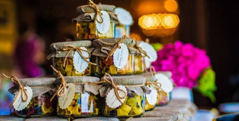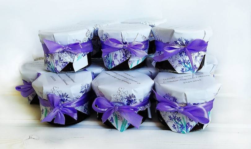 Можно приготовить для гостей на свадьбу варенье, изготовленное невестой или ее мамой. Если же домашнего угощенья нет, возьмите покупной мед, джем или драже и поместите выбранное лакомство в красиво декорированную стеклянную баночку. После того как презент будет съеден, баночка может стать интересной деталью интерьера. Баночку на свадьбу с медом украшают не только стразами и бусинами, но и дополняют стикером с оригинальной фразой или именами будущих супругов.