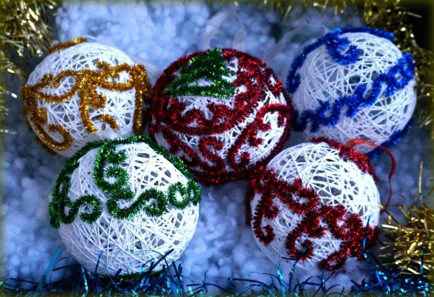 - нитки, остатки пряжи также подойдут. Отдавайте предпочтение разноцветным моткам, тогда композиция, созданная из елочных шаров, будет выглядеть особенно эффектно;