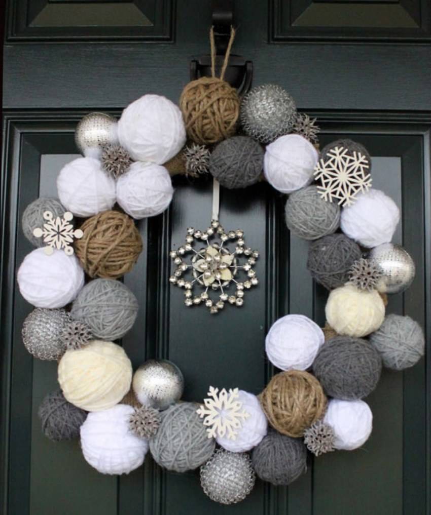 Часто елочные шары собирают в единую композицию, крепят к двери, используя в качестве новогоднего венка.