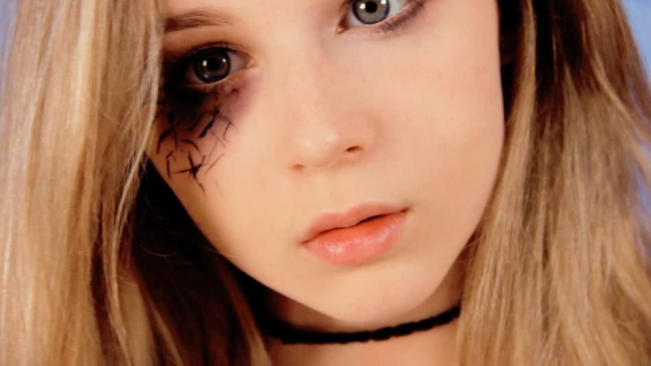 - На щеке, подбородке или виске гримом или кайалом нарисуйте пробоину или трещину – идеи макияжа на Хэллоуин для образа куклы сочетают прелесть и разрушение.