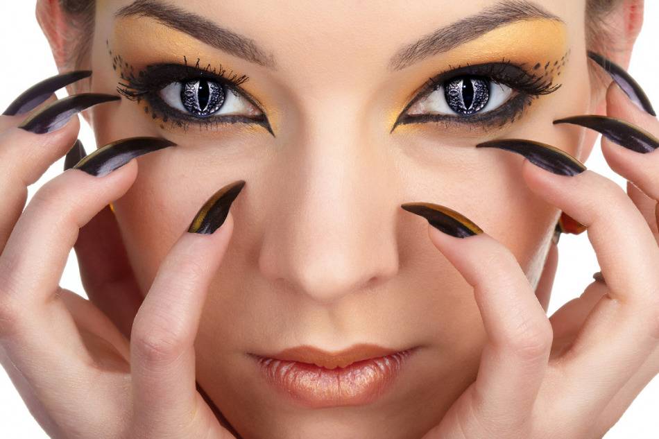- Приклейте длинные искусственные ресницы. Сделайте подводку глаз, чтобы они «распахнулись», стали больше. Тщательность прорисовки обеспечит вам красивый макияж на Хэллоуин.