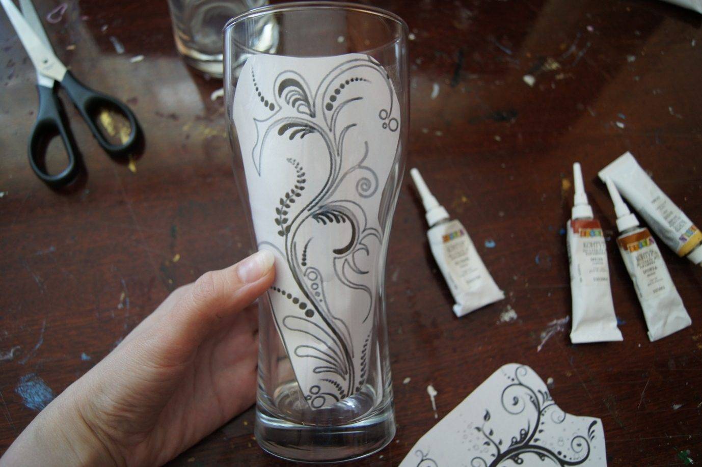 3. Используя кисти различного диаметра украсьте бокал узорами или надписями.