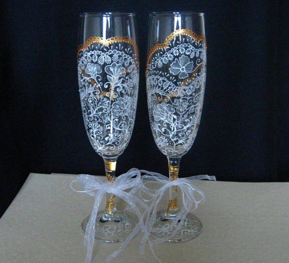 Роспись бокалов может содержать не только абстрактные фигуры, завитушки, цветы и т.д., но и имена молодоженов и дату бракосочетания.