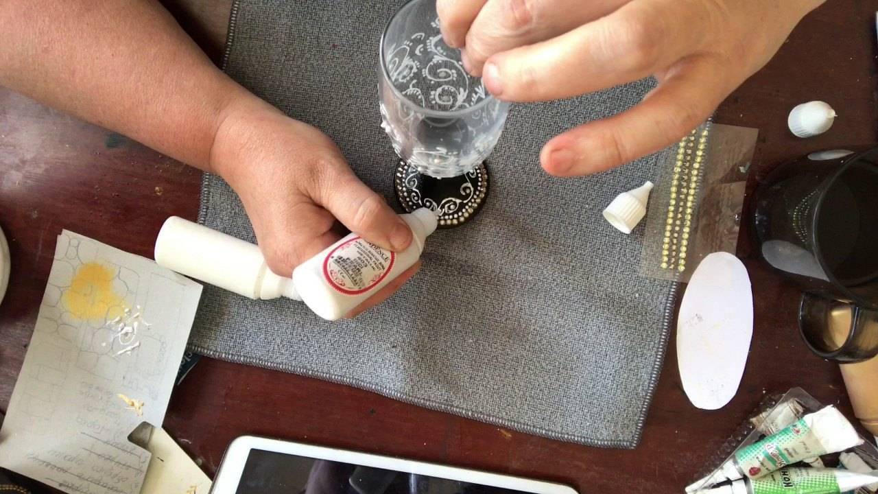 Расписанные с помощью витражной краски бокалы можно дополнить декоративными цветами, лентами, бусинами или стразами.
