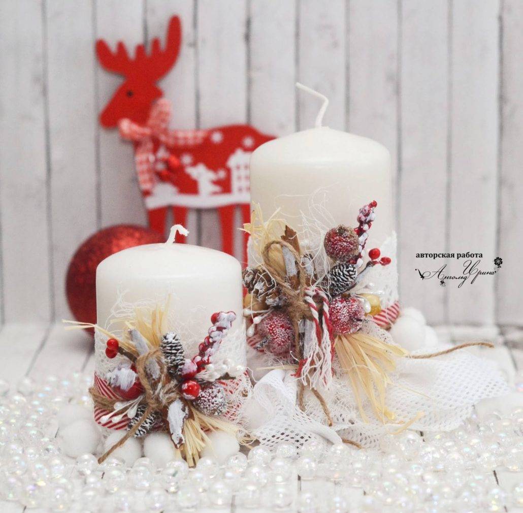 Сегодня в магазинах можно найти огромное количество разнообразных свечей, в том числе выполненных в новогодней тематике. Но для мастериц не составит труда сделать их самостоятельно. Чтобы сделать такое чудо самостоятельно, можно использовать красивый бокал, край которого украшают тесьмой, бусинами, а внутрь устанавливается плоская свеча.
