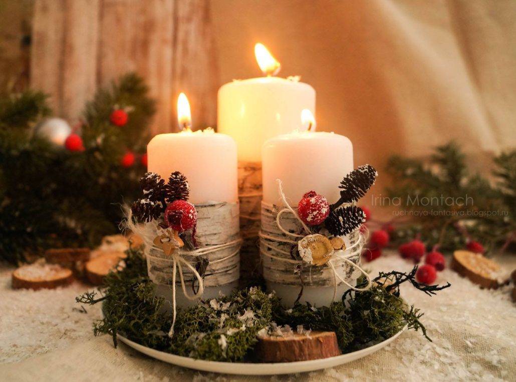 При помощи свечей, всегда можно создать уютную и романтическую атмосферу. Поэтому их нередко используют для декорирования помещений, в том числе и на Новый год. Объединив их с шишками, еловыми ветками или другим природным декором, у вас всегда получится оригинальная праздничная композиция.