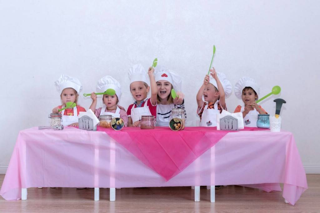 - подобрать для каждого ребенка “форму повара” — белые фартуки и колпаки. Это поможет сразу вовлечься в кулинарную игру и убережет одежду от загрязнений.