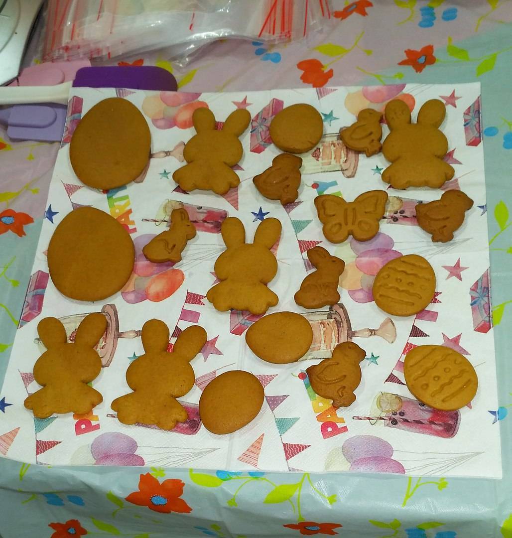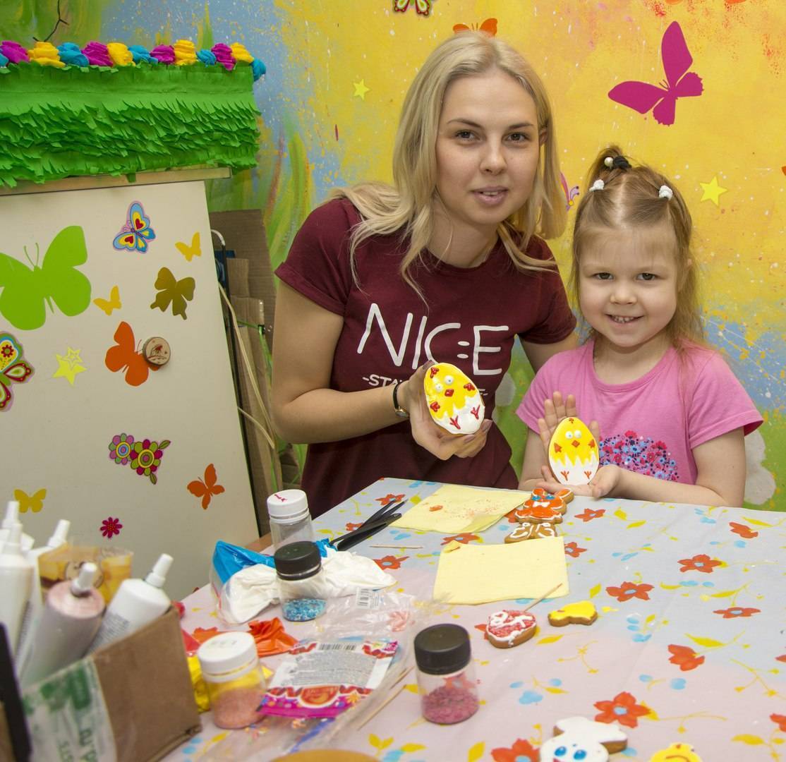 Роспись пряников мы приурочили к Пасхе, хотя особую популярность они обретают в Новогодние праздники. Надо ли говорить, что и это кулинарное развлечение прошло потрясающе! Даже игровая программа не понадобилась. Наверное потому, что происходило все в нашей игровой и дети равлекались самостоятельно.
