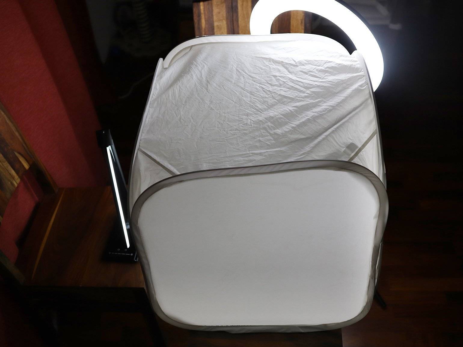 Он заменит белый предметный стол и рассеивающую насадку (лайтбокс) одновременно. Достоинства фотобокса: очень лёгкий, компактный — складывается втрое и убирается в чехол, а также недорогой — стоит около 2 тысяч рублей. Траты на его покупку невелики, а преимущества — огромны.