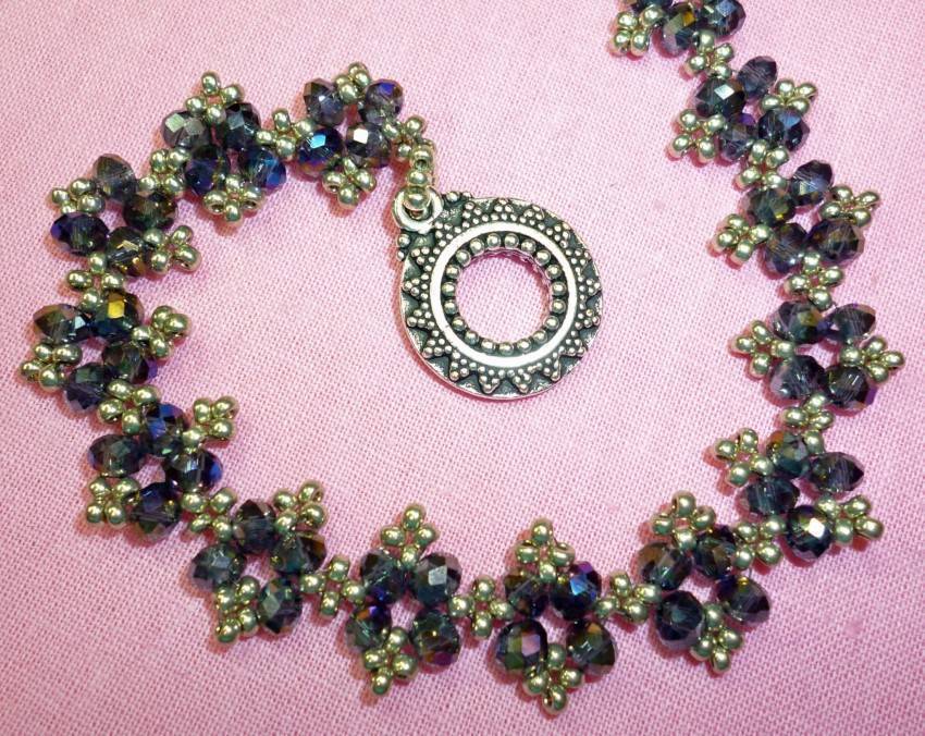 Для узора первый рядок наберите их бусин топаз с черным. В след.ряду будут дуги магатамы с меленьким бисером. После них рядок из черных бусин, бисера восьмёрочки цвета золота, делики, мелкого черного. Крайний рядок не будет стягивать, и фалдила, если необходимое количество бусин будет подобрано в индивидуальномпорядке.