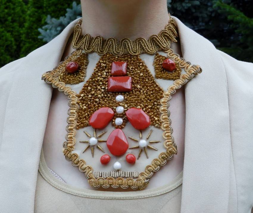 Для начала стоит нарисовать шаблон основы в виде воротничка на картоне. Вырезать заготовку по шаблону из войлока или другого текстиля. С помощью клеевого пистолета плотно приклеить бусины на заготовку.