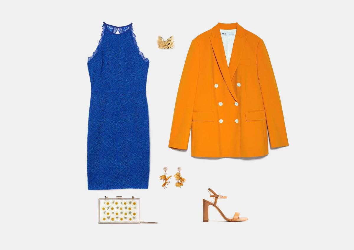 Первый образ, который я хочу вам предложить для выпускного 2020, построен на основе короткого коктейльного кружевного платья с открытыми плечами. Платье синего цвета, самого модного цвета сезона. Оно будет акцентом образа, все остальные элементы будут в тёплой оранжево-бежевой гамме. Это отличный вариант платья на выпускной в 9 классе.