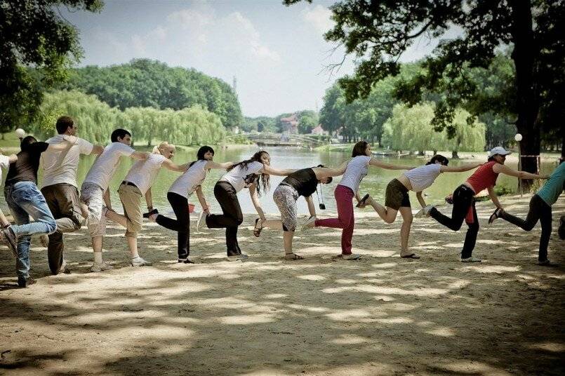 - Паровозик. Играют две команды, выстроившись друг за другом. На плечо первого в шеренге игрок кладет левую руку, а правую ногу поднимает и сгибает в колене, чтобы сзади стоящий смог за нее ухватиться. Так же поступают все последующие в шеренге. Команды должны в таком положение проскакать определенное расстояние до финиша.
