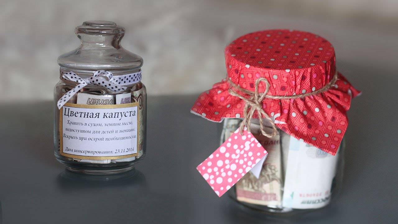 - Закатать банку с деньгами и написать шуточную этикетку. Например, «зелень сушеная», «цветная капуста».