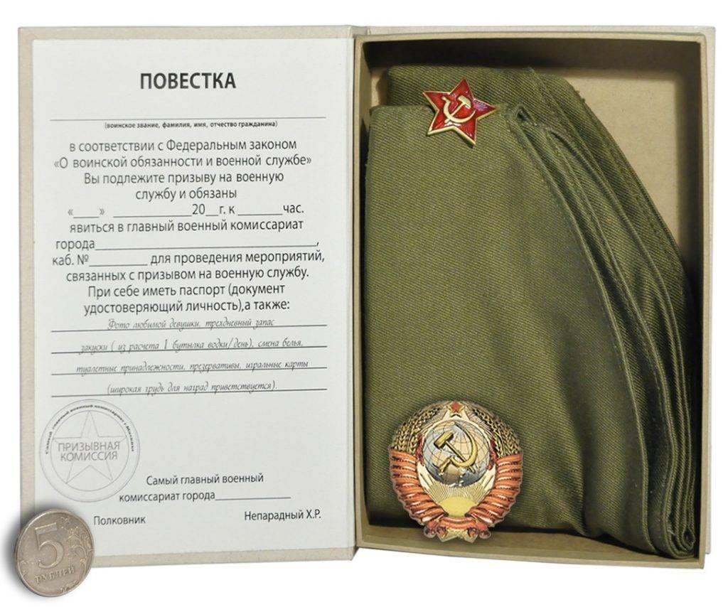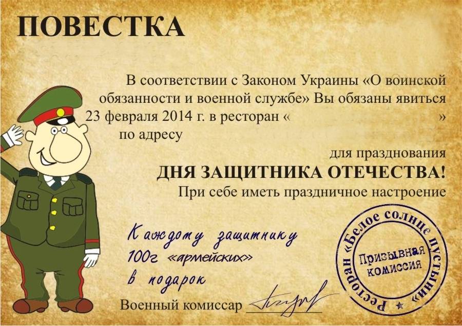 Повестка. Это поздравительная открытка и приглашение на корпоратив «в одном флаконе». Скачайте образец или составьте её самостоятельно, соблюдая все правила. Если вы хотите, чтобы она выглядела реалистично, не пишите в ней поздравления, придерживайтесь официально-делового стиля. Достаточно указать имя, фамилию и отчество адресата, а также место и время проведения торжества. Вручать такой «презент» должны представительницы прекрасного пола, переодетые в военную форму. Особенно актуально подобное приглашение, если праздновать 23 февраля вы планируете не на работе, а в ресторане или кафе.
