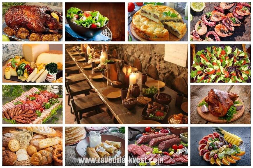 дичь, каши с грибами или мясом, запеченный поросенок, окрошка, запеканка, гусь в яблоках, жаркое;
