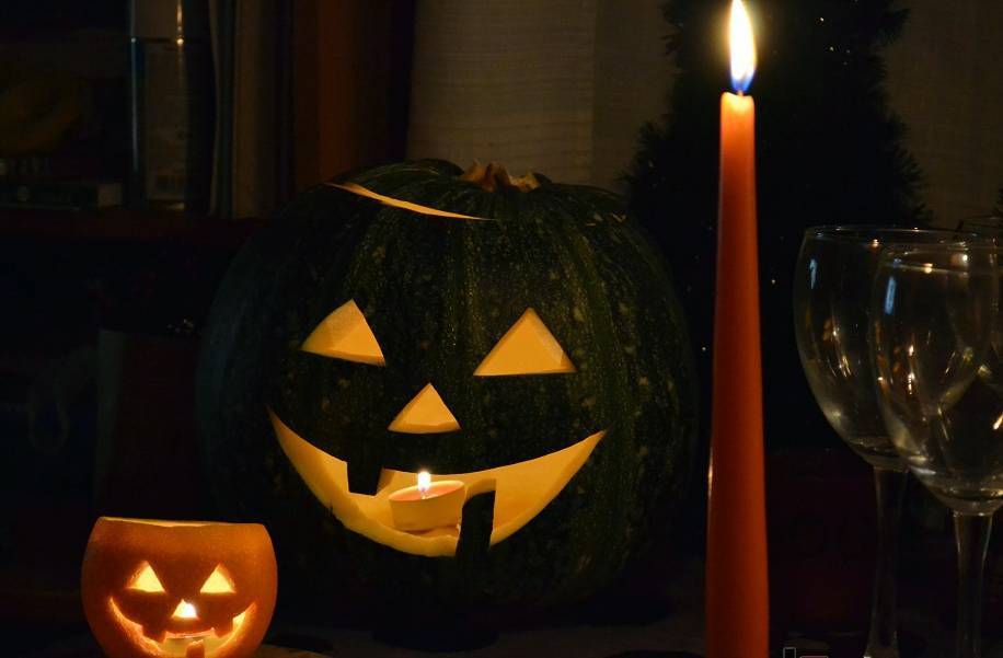Устрашающе выглядят толстые свечи в руке старого манекена (нужна только рука). На зеркалах нарисуйте безумные, яростные глаза – они точно испугают ваших гостей. Картины с белой марлей сверху обрызгайте «кровью» — это поможет создать впечатление недавнего скрытого убийства. Не забудьте вырезать и поставить на подоконник горящую тыкву-фонарь: главный декор Хэллоуина.