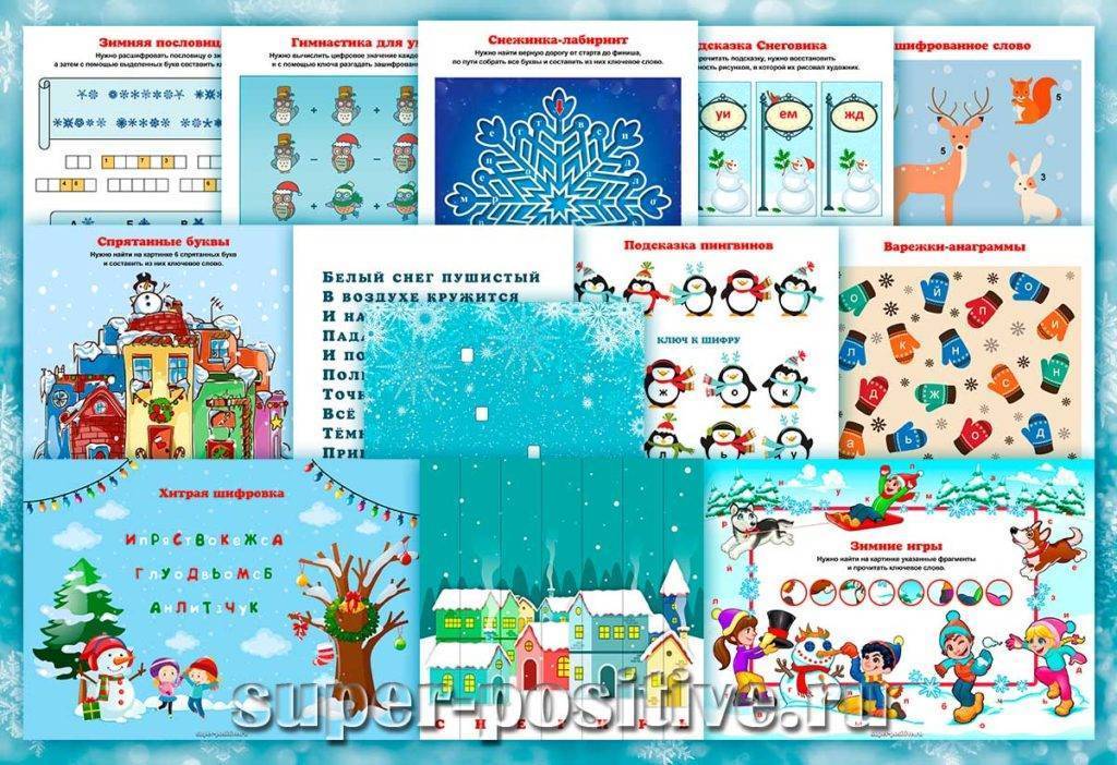 - Квест содержит 10 видов красочно оформленных в зимней тематике заданий на основе словесных игр и различных видов шифров.