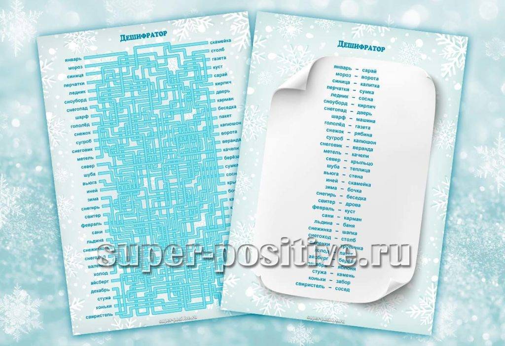 - Зимнее стихотворение (ванная, газета, ваш вариант). Шифровка в шпионском стиле. Задача игроков – догадаться, что делать с двумя найденными листами.
