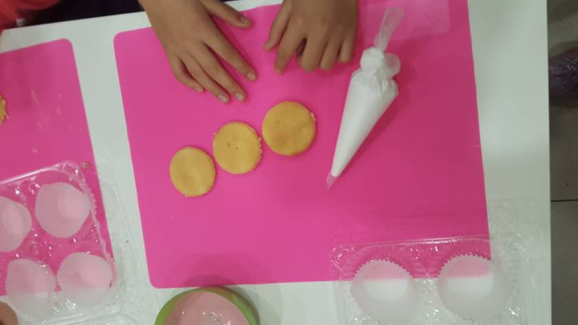 “Детки делали маршмеллоу в глазури. Чудесный десерт. У нас в семье был признан самым вкусным)). Делается просто. Насчет мисочек с глазурью и украшением, ну меня честно особо не напрягало, что им приходилось общаться с соседом и договариваться, делая десерт по очереди)). Затем пирожное с кремом, ну почти мини-тортик. Тут все просто и понятно – бисквит заполняется кремом и украшается по вкусу. Опять же надо добыть украшения, но рядом были мамы и они помогали. Думаю, даже если и не было нас там, детки бы отлично договорились.”