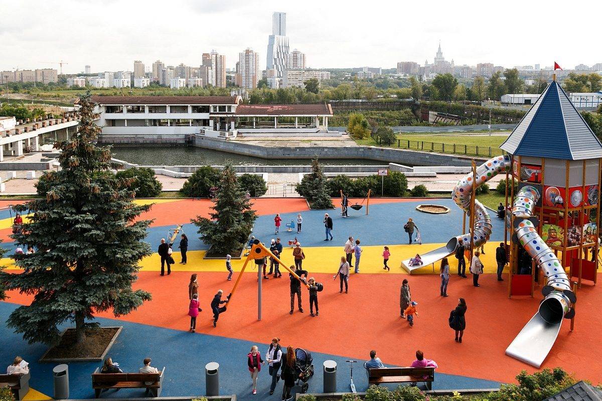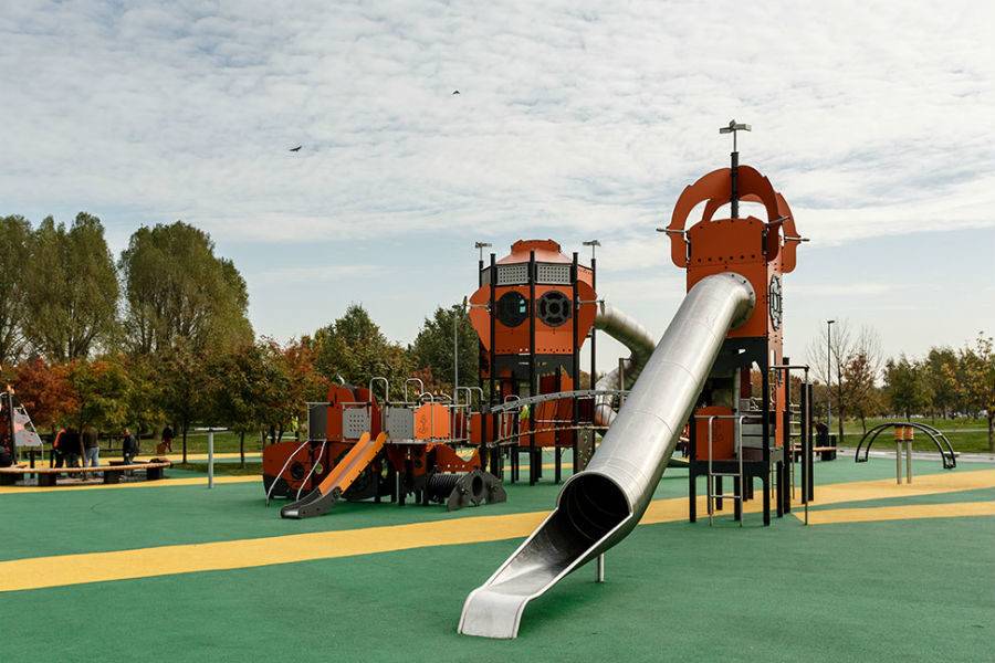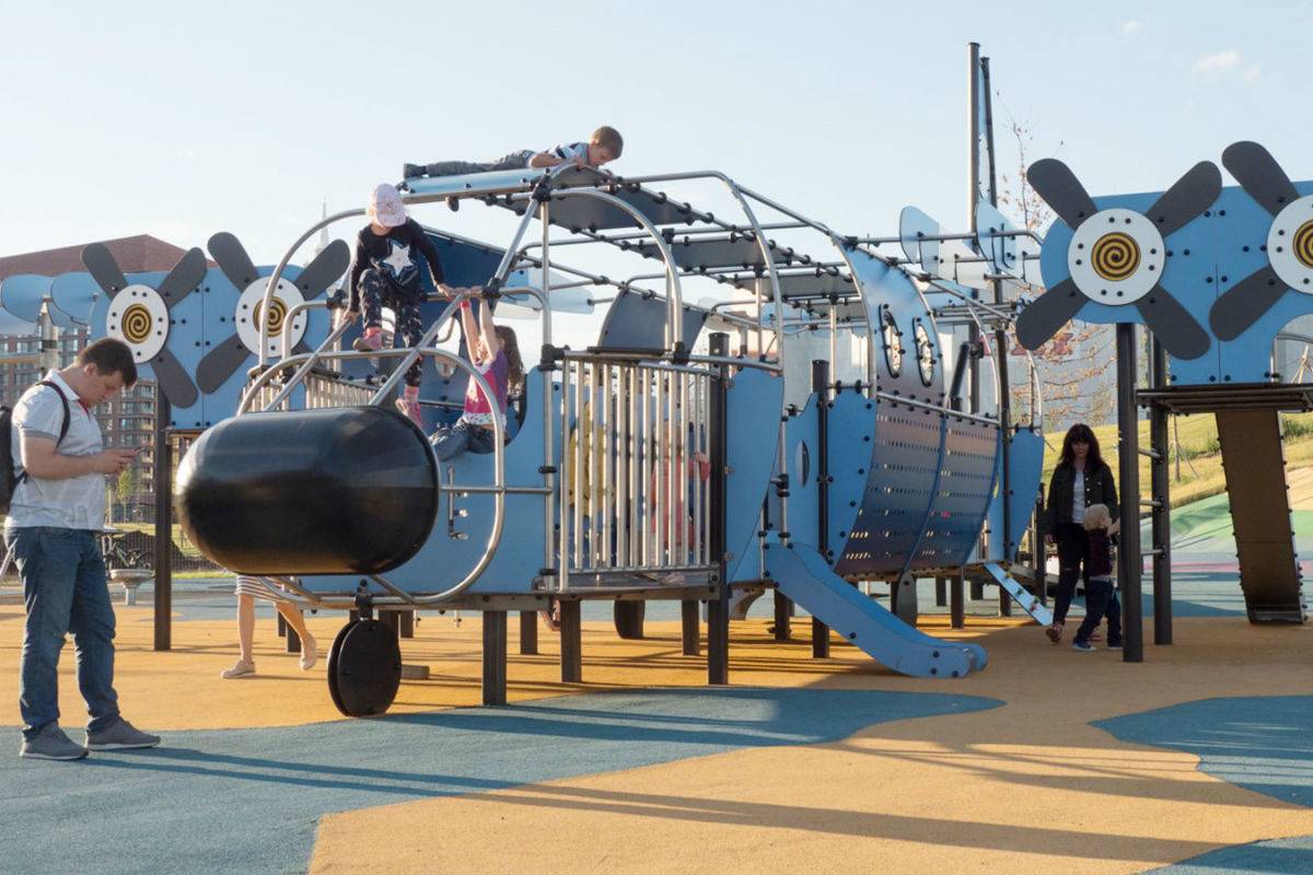 В начале XX века неподалеку от Ходынского поля находился аэродром. Неудивительно, что лейтмотивом для детской площадки в новом парке здесь стала как раз тема полета. Центральной конструкцией пространства стал сложносочиненный игровой комплекс в виде самолета – на его борту можно и полазить, и покататься с горки. На территории площадки также разместились разнообразные тоннели, лестницы, горки и лабиринты, замаскированные под небо, радугу и земли, над которыми и «пролетает» фигура самолета. А для настоящего ощущения взлета малыши могут попрыгать на мини-батутах в «облачных» участках площадки.