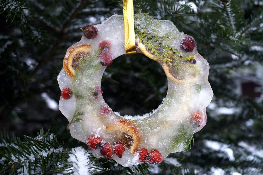 К таким емкостям можно прикрепить ленты или проволоки, чтобы прикрепить их к елке. Эффектно использовать декоративные материалы такого же оттенка, как и краситель для воды. Лед будет выглядеть более прозрачным и красивым, если использовать очищенную воду.