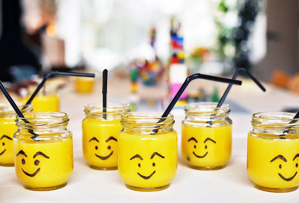 В качестве подставок под тарелки используйте бутафорские детали подходящего размера – многоуровневая сервировка всегда смотрится выигрышнее. Коробки с соком тоже спрячьте под бумагу с кружочками. Из настоящего конструктора соберите «стаканы» для вилочек, «тарелки» для кексов/фруктов (подстелите салфетки).