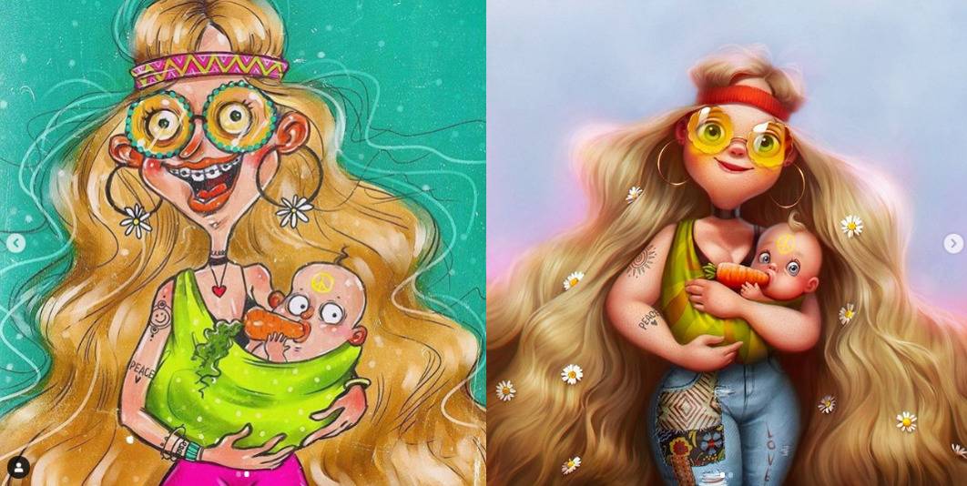 Среди участников и новички, которые ищут свой стиль, и опытные игроки, которые его оттачивают. Буквально месяц назад вызов от художницы Маши Горбуновой, которая рисует в инсте милые шаржи на материнство, приняла Лера Кирякова, иллюстратор и амбассадор Wacom: