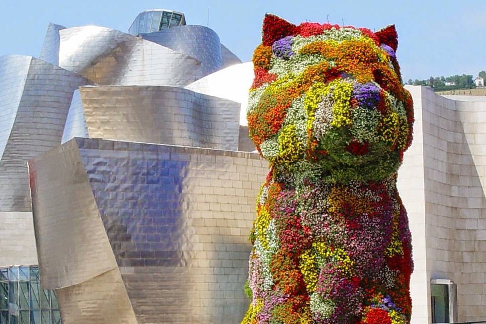 Пожалуй, два самых известных экспоната музея в силу своих размеров выставляются не внутри здания, а перед ним. Это огромный металлический паук американки Луизы Буржуа и 13-метровый щенок американского художника Джеффа Кунса, сделанный из живых цветов. Кстати, изначально предполагалось, что щенок погостит в Бильбао лишь некоторое время и уедет, но посетители музея так полюбили «малыша», что руководство решило его оставить.