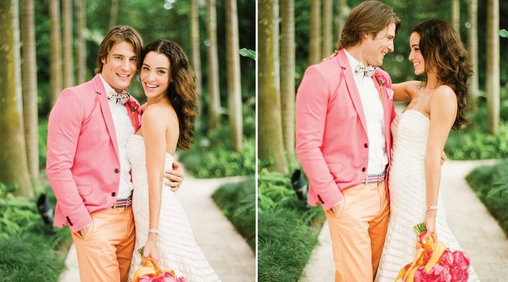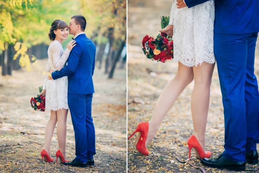 Нередко цвет обуви невесты сочетается с галстуком ее избранника или бутоньеркой в его петлице. Такие ансамбли выглядят изысканно, позволяя создавать своеобразную вариацию популярного нынче familylook. Еще более неожиданным, но при этом крайне стильным и удачным решением, станет яркий цветовой тандем обуви новобрачной и носков жениха. Сочный бордо, жизнеутверждающий желтый, теплый оранжевый, все оттенки бирюзы – в любом исполнении дуэт не останется без внимания гостей, позволит молодоженам стать обладателями самых трендовых, далеких от стандартных шаблонов свадебных фото.