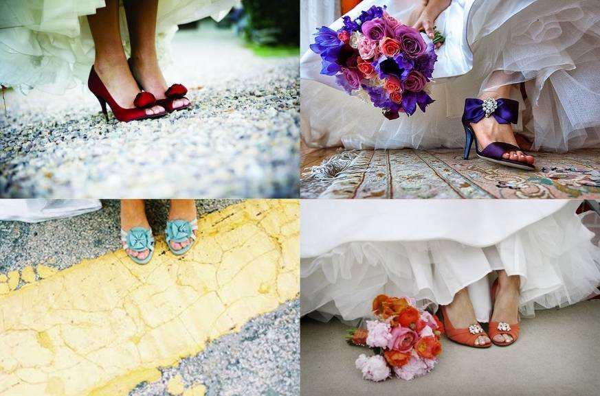 Выбор цвета – современная мода нарядов для подобного счастливого праздника допускает надевать туфли с множеством расцветок. Кроме традиционных белых туфель, нередко можно наблюдать айвори – цвет слоновой кости, обувь всевозможных пастельных тонов, шампань. Наиболее смелые девушки применяют и яркие краски. Самое основное правило – цвет туфелек должен сочетаться с тоном свадебного платья. Подобная гармония может достигаться аксессуарами, дополняющими наряд (цветами, сумочкой, вышивкой, лентами, бантами).