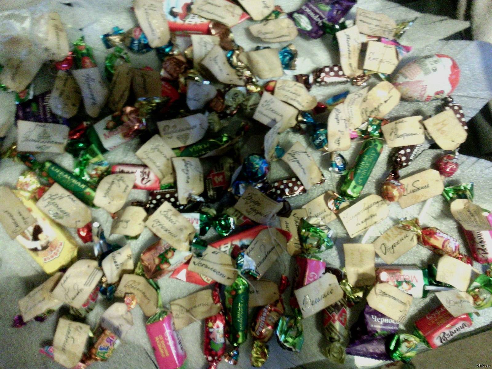 Пожелания подбирайте, ориентируйтесь на праздник или самого человека, которому вы дарите подарок. Это могут быть поздравления, наставления, комплименты, фразы и высказывания известных людей. Чтобы оставить впечатления от подарка, старайтесь приобретать вкусные и не дешевые конфеты. Записки со словами крепите на двусторонний скотч или клей (в зависимости от материала оберток конфет).