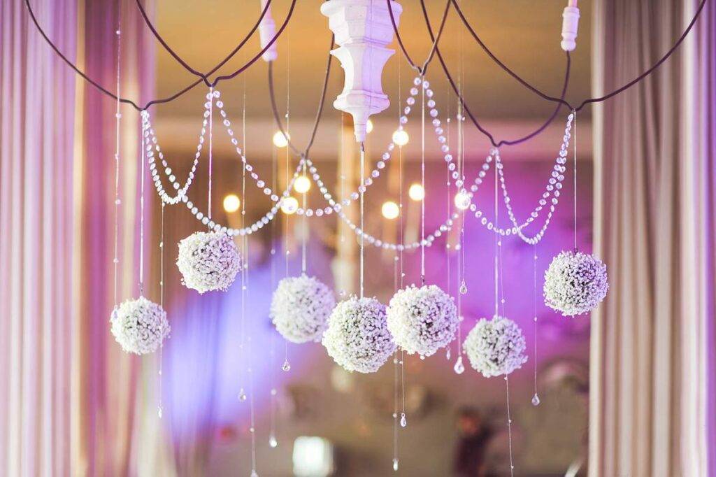 Потолок комнаты украсьте разными свисающими конструкциями из бус, бантов, бумажных поделок. На люстру повесьте снежинки, перья, небольшие елочные шарики. Светящиеся огоньки развесьте по шторам и под потолком.