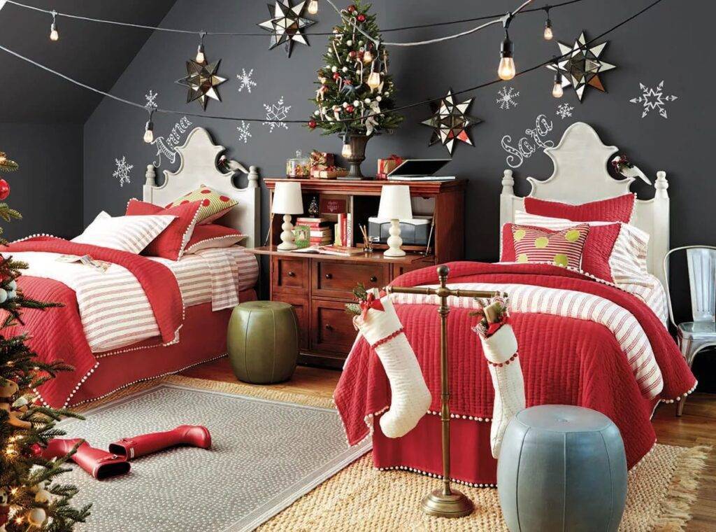 В детской уместна маленькая живая елка с минимумом игрушек. Создать волшебную атмосферу поможет светодиодная гирлянда на шторах и потолке, снежинки на окошках, деревянные или мягкие игрушки – снеговик, Дед Мороз, Снегурочка, а также рождественские носки, бумажные гирлянды, праздничные плакаты и новогодние венки на стенах, постельное белье с соответствующими рисунками.