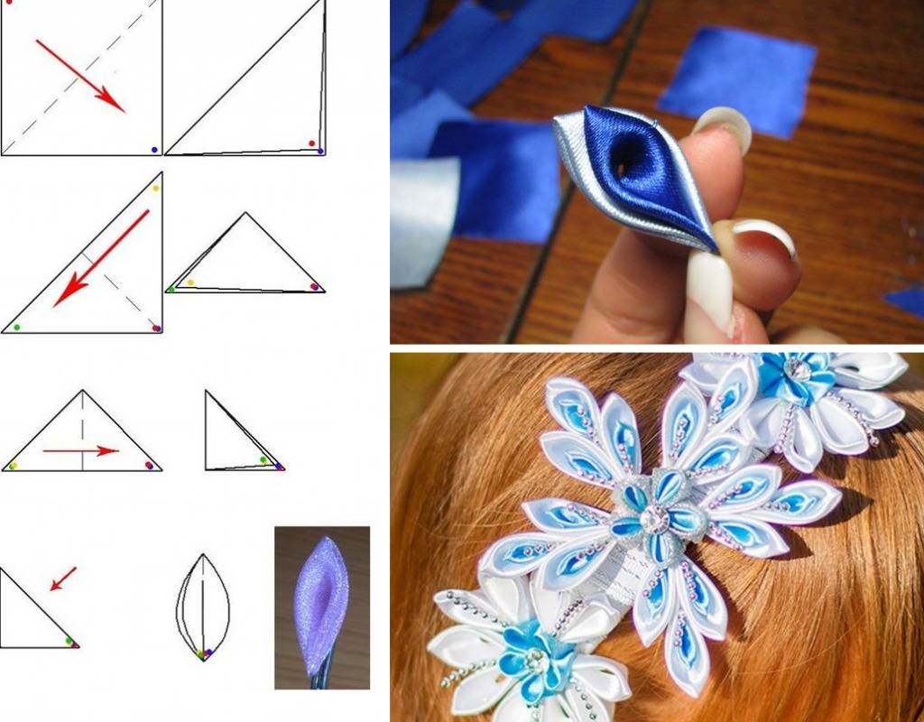 Для более сдержанных вариантов изделий для волос подойдет техника канзаши. Выполняется работа из ленточек, которые накладываются на обмазанную клеем основу. Для таких изделий важна практика.