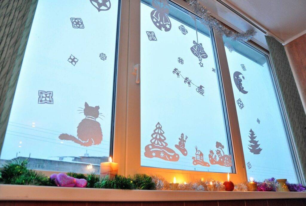 На стеклах уместны наклейки или рисунки красками в стиле Нового года. Можно превратить окна комнаты в целый зимний пейзаж, если у вас есть способности к художеству.