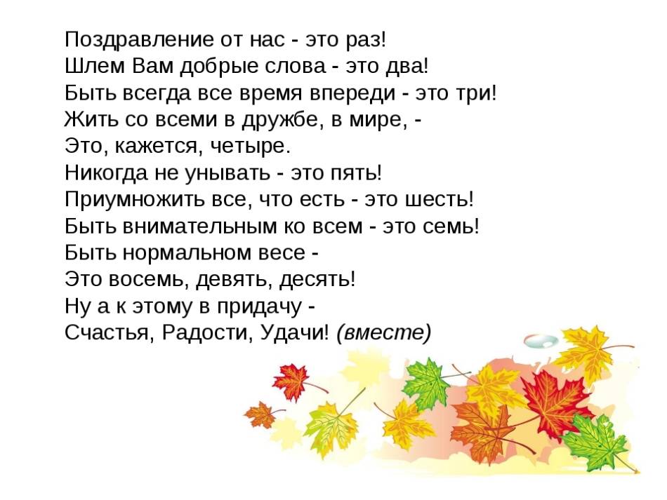 Полсотни лет – хороший срок,И нет нужды печалиться.Пускай ещё полста пройдёт,Не надо только стариться!И в этот светлый, славный деньТебя мы поздравляем,Здоровья, счастья и добраОт всей души желаем!