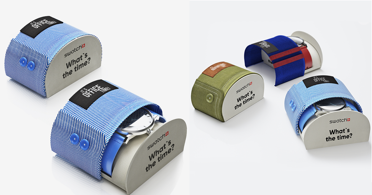 Ничего ли вам не напоминает концепт дизайна упаковки часов Swatch? Да, все верно, это манжеты рубашки. Крышка слайдер открывается также, как мы отодвигаем манжету рубашки, когда нас спрашивают «Whats’s the time?». Каждая из упаковки отвечает на этот вопрос по-разному.