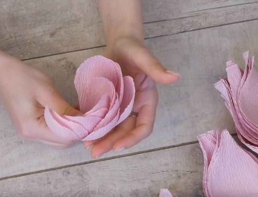 - После того как все лепестки вырезаны, скругляем их и пальцами выгибаем, формируя красивую форму. Маленькие и большие лепестки загибаем в разные стороны. Жатая бумага очень хорошо поддается, главное, не перестараться и не разорвать ее, делайте все с небольшими усилиями.