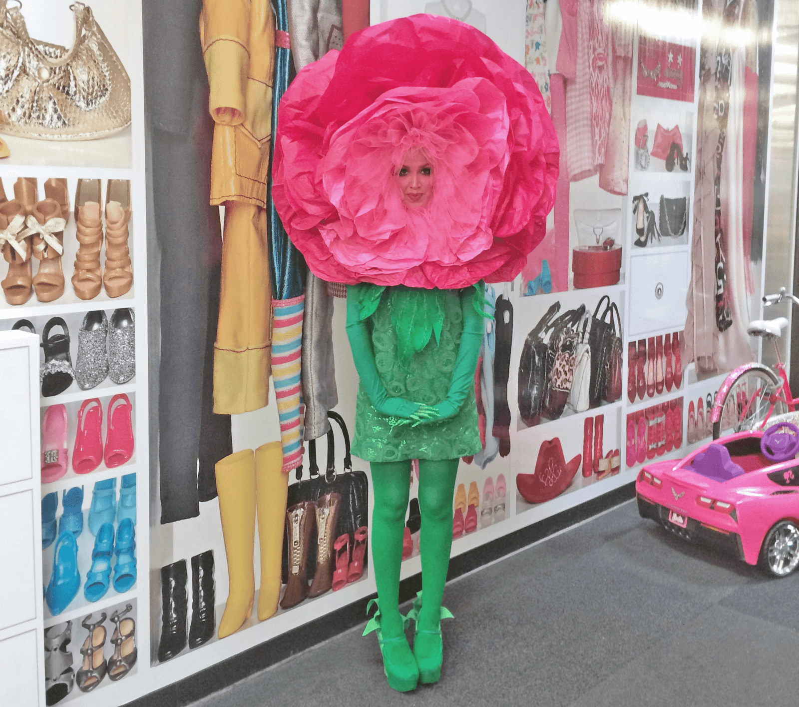 Однако не только для фотозон можно использовать большие цветы из гофробумаги. Они могут служить удивительным костюмом для театральной постановки или тематической вечеринки.