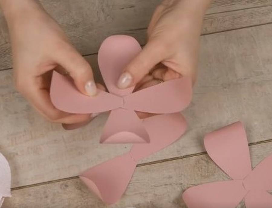 Пришло время собирать наш необычный и пышный декор. Начнем с лепестков под номером 1, которые будут составлять центральную часть бутона. Один из лепестков сложите пополам