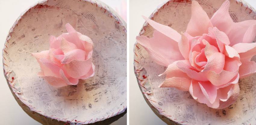 Большие цветы из бумаги выполните с разными текстурами бумаги. Возьмите обычную и гофрированную. Это изменит внешний вид всей композиции. Цветы из гофрированной бумаги проще использовать, они легче по весу, бумага послушно принимает форму. Лепестки сложите в бутон и зафиксируйте их клеем. Накладывайте более крупные лепестки, пока не получится сама роза.