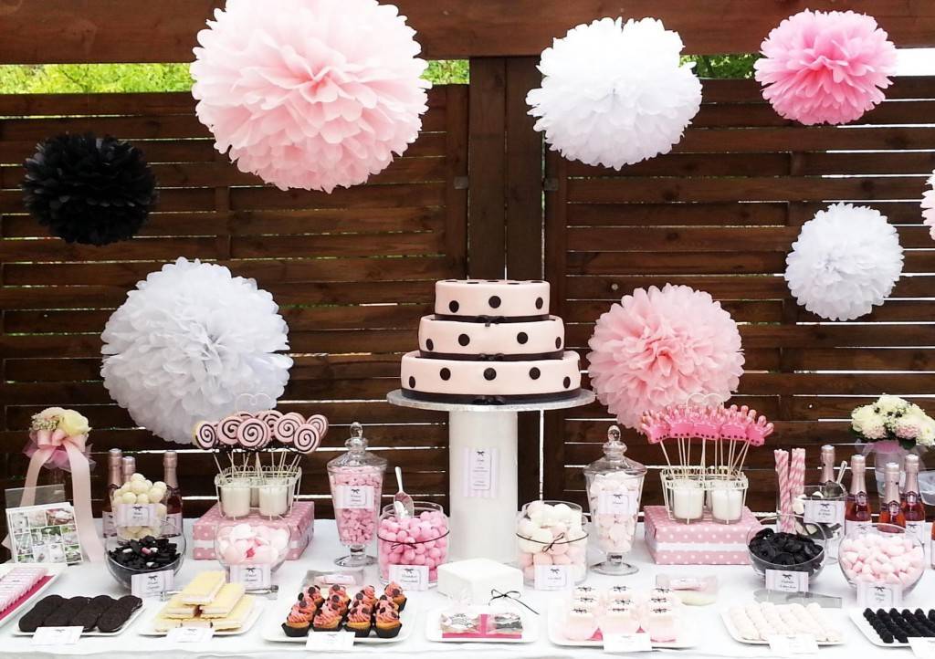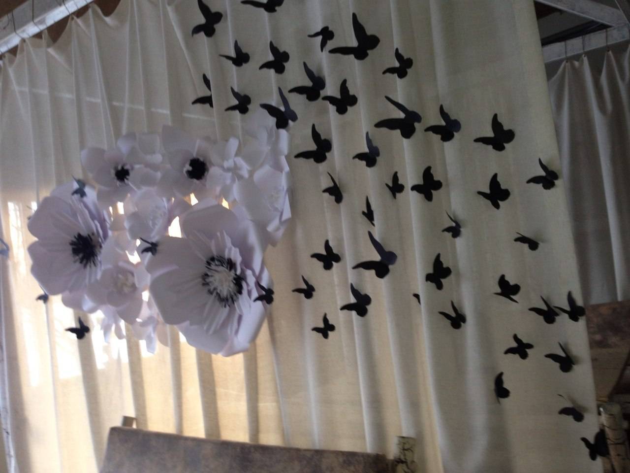 Стены украшают объемными или плоскими цветами самых разных форм. Можно создать композицию из цветов разного размера, листьев, лент, добавить драпировку. Лучше, конечно, выдержать их в одном стиле или цветовой гамме. Бумажные бутоны могут напоминать пионы, розы, ромашки, маки или быть фантастических форм. Иногда крупные экземпляры располагают островком, а вокруг развешивают более мелкие. Также можно вырезать стайку бабочек из бумаги схожих тонов.