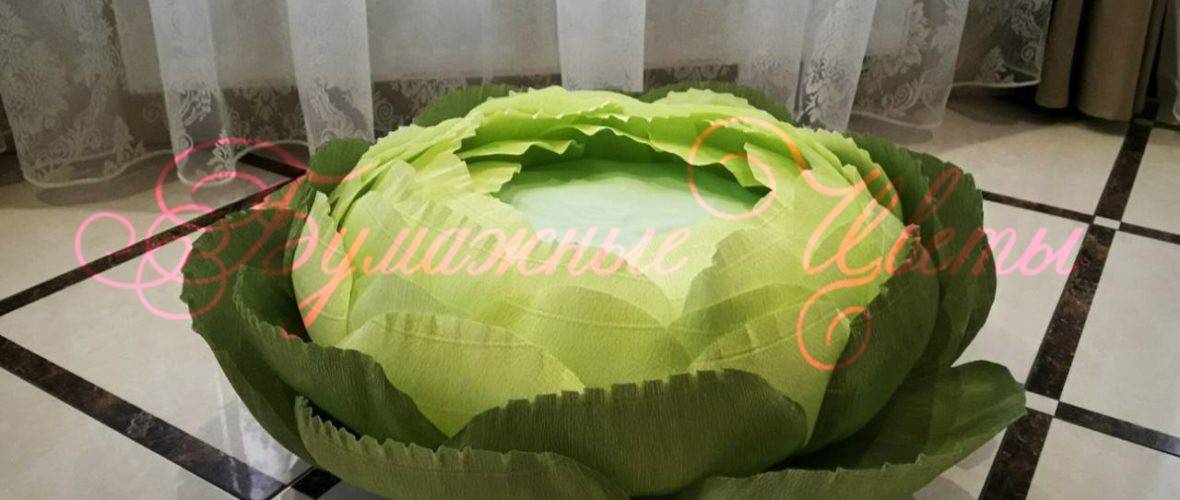 А эта очаровательная капуста из гофрированной бумаги станет отличным антуражем к детской фотосессии. Изготавливается по принципу плоских цветов – на картонном основании. Чтобы малышу было удобно, в серединке расположена подушка.