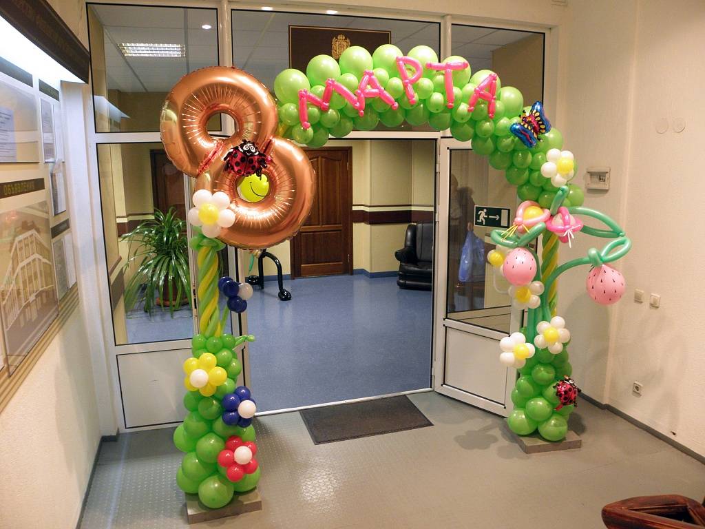 На 8 марта в офисы заказывают оформление воздушными шарами: больших размеров восьмерки, композиции в виде букетов, связки шаров с поздравительными надписями, подвесные гирлянды. Цветовая гамма обычно выбирается в корпоративном стиле компании или в других популярных оттенках: красном, розовом, золотистом.